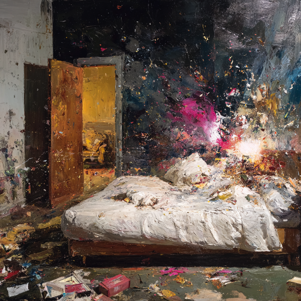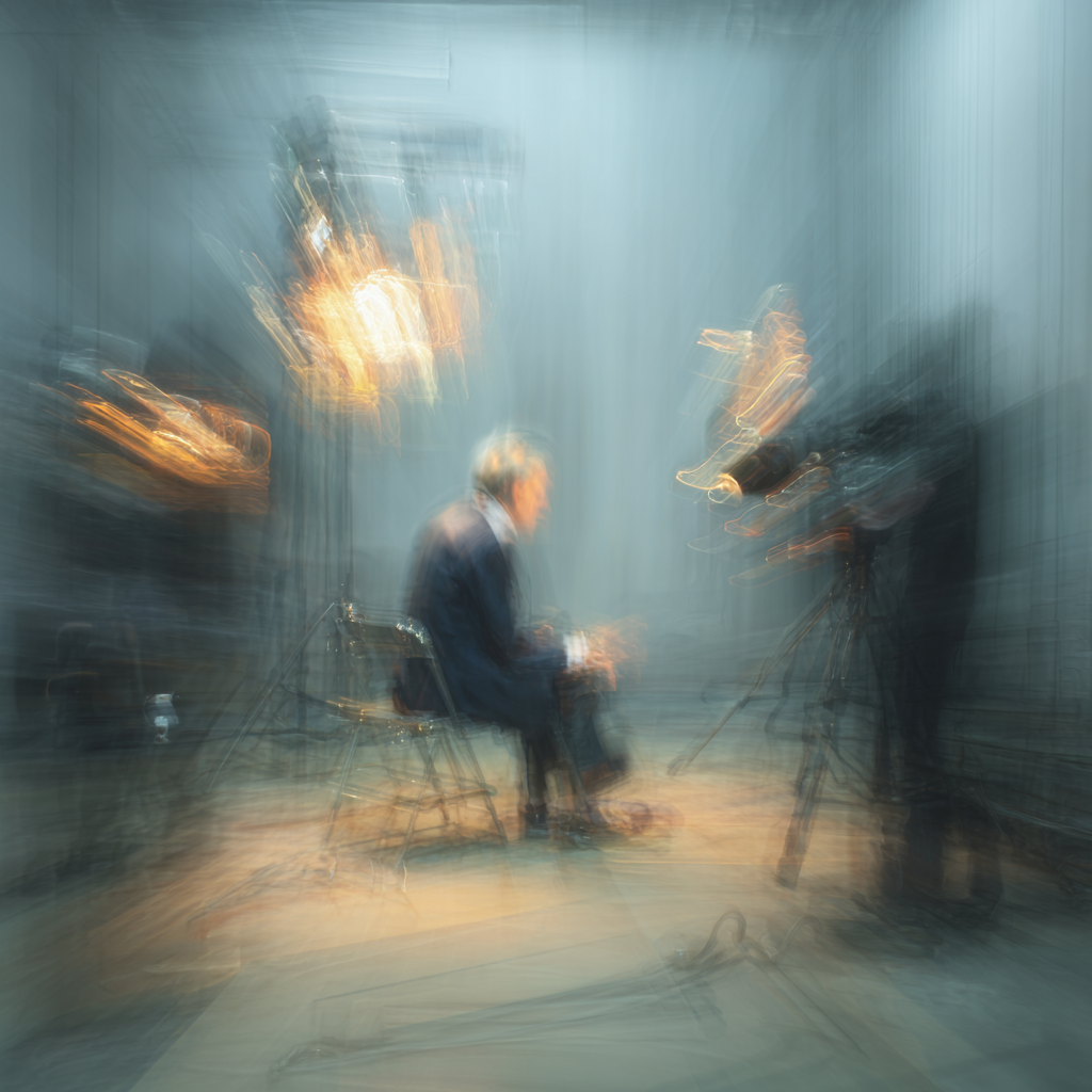 He tells it with a teacup and a doorway and a man who might have been reaching for something. He has told it so many times he almost believes it. Almost. The almost is the space where he lives now. The almost is the room he walks through every day on his way to the car, the studio, the chair, the lights.