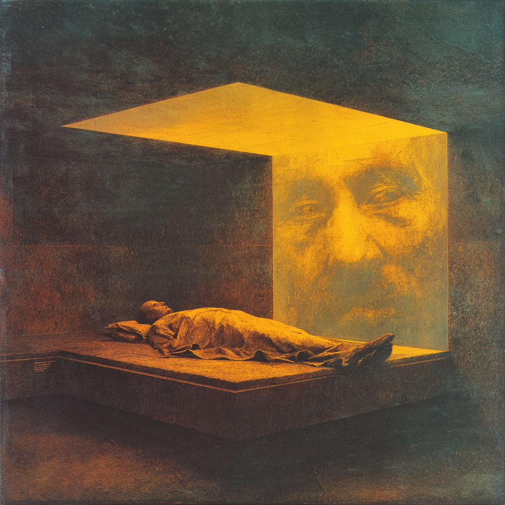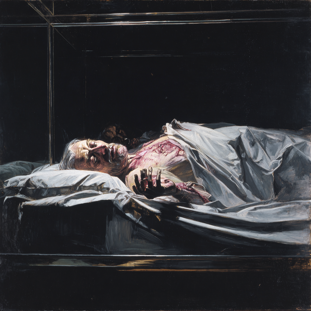 The man is there. The man is always there. Not standing. Lying down. The way he was lying down when the door came in. The sheets white and then not white. The eyes open. The hands still reaching for nothing. Still open. Still soft.