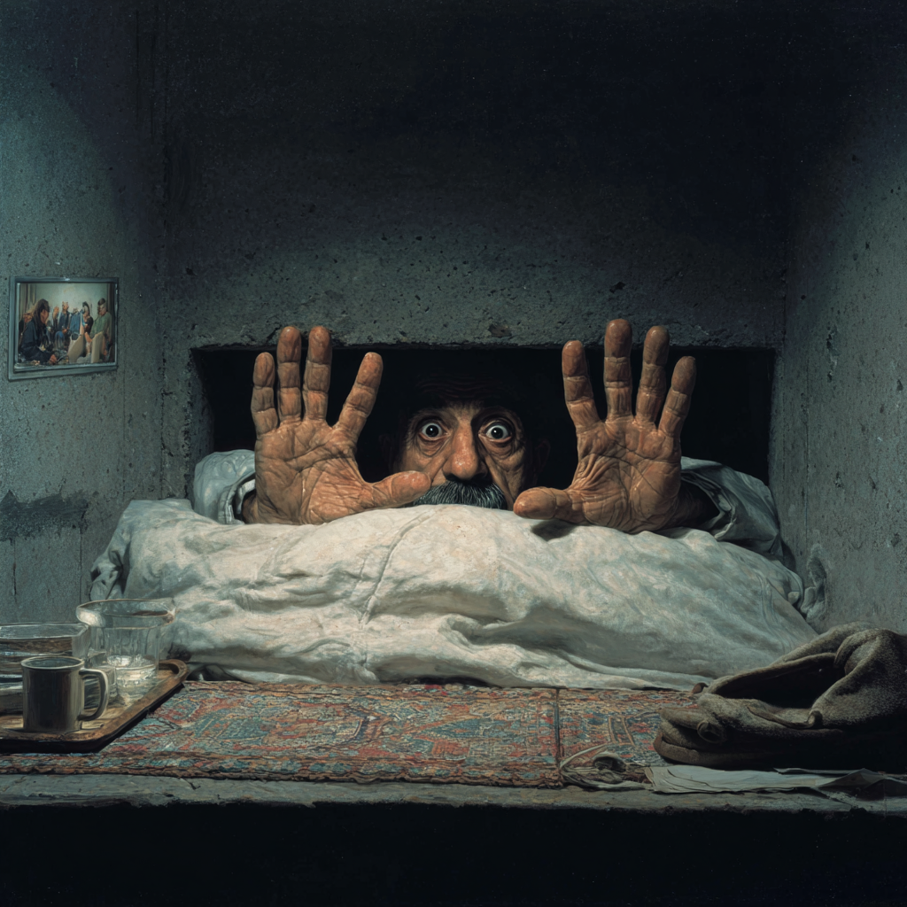 The man was in his bed. Sleeping or almost sleeping. The door came off the hinges and in the half-second before it ended the eyes opened and the hands came up, not reaching for a weapon, just up, the way hands come up in dreams, in surprise, in the last animal moment before the body understands what is happening to it. The hands were empty. The hands were soft. The fingers curled toward the palms like a child's.